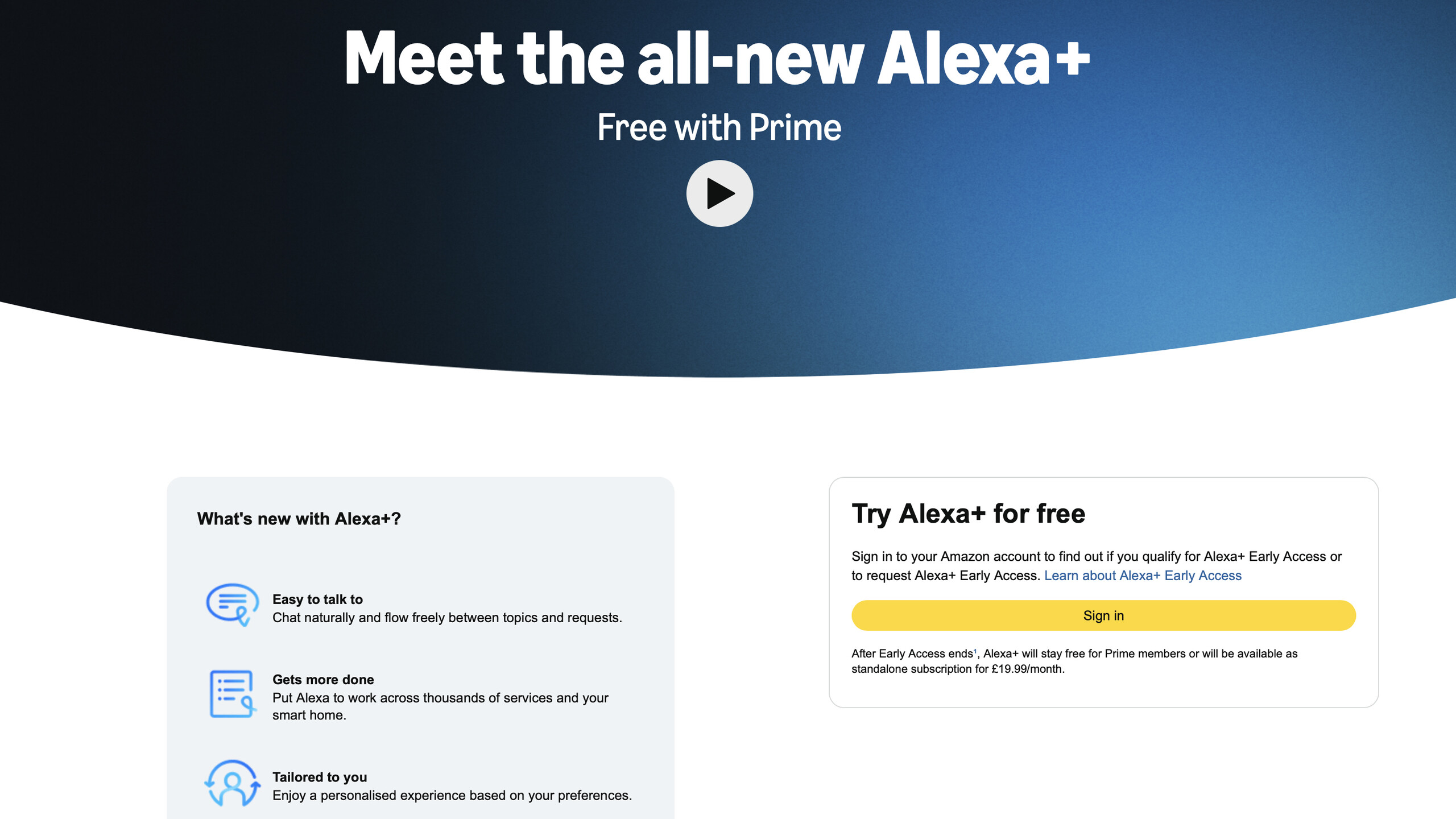 Ensuite, vous devez enregistrer votre intérêt pour Alexa+, car le service est actuellement uniquement sur invitation. Rendez-vous sur www.amazon.co.uk/newalexa, puis inscrivez-vous au service en vous connectant avec votre compte Amazon. Cela enregistrera que vous souhaitez accéder au service, et il vous suffira ensuite d’attendre.